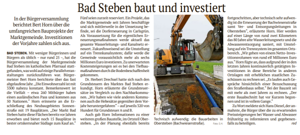 Erneuerung der Bachwiesenstraße – In der Planung weit fortgeschritten, aber technisch sehr aufwendig ist die Erneuerung der Bachwiesenstraße im Ortsteil Obersteben. Auf einer Länge von rund zwei Kilometern steht die Erneuerung der 80 Jahre alten Wasserleitung sowie die Sanierung der Abwasserentsorgung mit Umstellung auf ein Trennsystem im gesamten Ortsbereich an.“ Hier gehen wir von einem Netto-Investitionsvolumen von rund elf Millionen Euro aus“, teilte Horn mit und ergänzt, dass aufgrund der in den letzten Jahren kontinuierlich getätigten Investitionen in anderen Ortslagen mit erheblichen staatlichen Zuschüssen gerechnet werden könne. „Ebenso laufen die Gespräche hinsichtlich einer Bezuschussung des Straßenbaues selbst.“ Gerechnet wird mit einer Bauzeit von mindestens zwei Jahren. „Wenn die Zuschusssituation geklärt ist, soll mit dem Bau 2024 begonnen werden.“